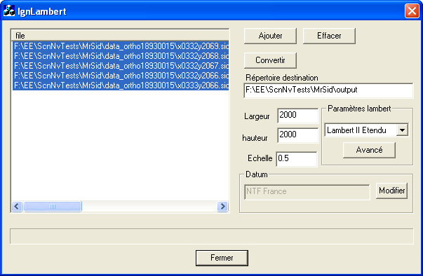 Téléchargez MrSidModule.zip et décompresser les 3 fichiers inclus mrsidinfo.exe, mrsiddecode.exe, et IgnLambert.exe, dans le répertoire d'installation de ScanNav. ScanNav se réservant la possibilité de demander une participation pour cette fonctionnalité par la suite, la lecture des fichiers au format MrSid est protégée par un code licence spécifique. Dans cette version, cette licence est cependant fournie gracieusement. Pour l'obtenir, faire une demande auprès de postmaster@scannav.com, en joignant le fichier ScanNav.cfg issu de "Demande de Licence". Note: Le module MrSid utilise les composants mrsidinfo.exe, mrsiddecode.exe qui sont la propriété de LizardTech : www.lizardtech.com