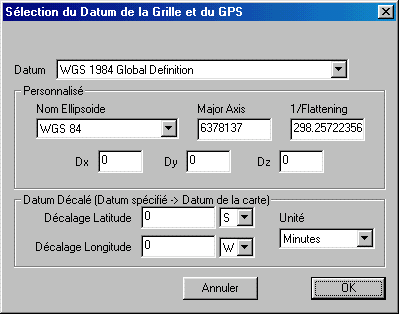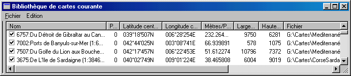 La liste est constituée d’une ligne par carte avec les infos appropriées (nom, latitude/longitude centrale, échelle, …), chaque ligne étant précédée d’une case à cocher. Si l’on décoche cette case, cela inhibe temporairement la carte : Elle ne sera plus prise en compte par le mécanisme de chargement / déchargement pour couvrir la surface de l’écran. Cela peut être utile dans certains cas limite où l’on se trouve entre 2 résolutions de zoom, pour empêcher le logiciel de choisir une carte précise. On peut également jouer sur les priorités des cartes pour afficher en préférence telle ou telle carte (une carte de plus haute priorité sera affichée en préférence). Ces priorités peuvent être changées avec le menu " Edition-Propriétés " lorsqu’une ou plusieurs cartes sont sélectionnées. On peut également afficher la carte sélectionnée avec " Edition-Charger "