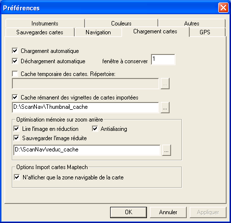 L'onglet "Chargement cartes" des Préférences (accessible par l'entrée "Préférences" du menu fichier) permet de paramétrer la façon dont ScanNav va charger les cartes en mémoire, ainsi que divers paramètres permettant d'améliorer sensiblement les performances.