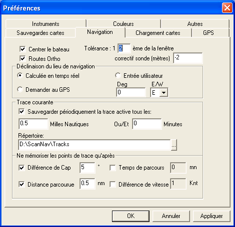 · "Déchargement automatique" indique à ScanNav de décharger automatiquement les portions de cartes non visibles à l'écran, ceci avec une certaine tolérance, indiquée dans "fenêtre à conserver". Cette valeur définit le nombre d'écrans à conserver hors de l'écran courant. Par exemple, pour une valeur égale à 1, cela signifie que l'on garde en mémoire un écran en vertical, et 1 écran en horizontal, c'est à dire que les images ne seront pas déchargées tant qu'elles ne sont pas sorties de la zone d'affichage de plus d'1 demi-écran vers la gauche, la droite, le haut ou le bas (on garde donc en mémoire l'équivalent de 4 écrans). Si la valeur est 0, toute image sortie entièrement de la fenêtre est déchargée. Cette case devrait également toujours être cochée.