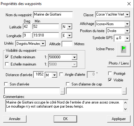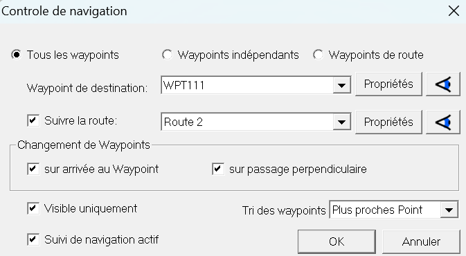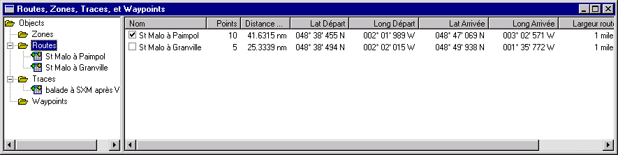 · Case à cocher : cochée si l’objet (zone route ou waypoint) est "actif"