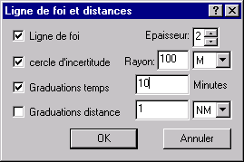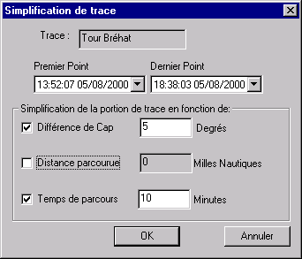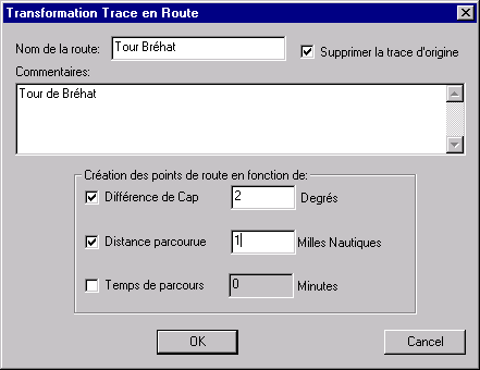 · Transformer en Route: (valable uniquement pour les traces, lorsque "Traces" est sélectionné dans la partie gauche). Ceci permet de transformer une trace en route. En fonction de plusieurs critères: changement de cap, distance parcourue, et temps écoulé, qui peuvent êtres renseignés par le dialogue suivant: