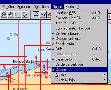 Un rectangle rouge indique la zone de la carte visualisée dans la fenêtre principale. Si ce cadre est invisible, c'est que la fenêtre principale est en dehors de la couverture de la carte, ou que la zone est trop petite ou trop grande pour être significative.