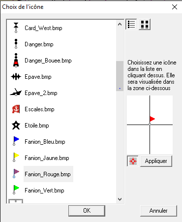 Il suffit de mettre le fichier .bmp dans le sous-répertoire "Icons" du répertoire d'installation de ScanNav pour rendre la nouvelle icône accessible. Si vous le désirez, et si vous me les envoyez, je peux tenir une base de symboles utilisateurs que je mettrais à disposition sur le site.
