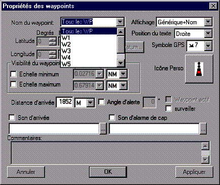 Lorsqu'on visualise les propriétés de plusieurs waypoints en même temps (par exemple tous les waypoints d'une route, ou plusieurs waypoints sélectionnés dans la fenêtre "Objets"), le champ de saisie du nom du waypoint est remplacé par une liste déroulante. Celle-ci comporte autant d'entrées que de waypoints concernés plus un spécial "Tous les WP" en tête de liste. Si on sélectionne celui-ci, seuls les champs pouvant être communs à plusieurs waypoints sont modifiables, et les modifications apportées seront appliquées à tous les waypoints de la liste. Pour modifier uniquement un des waypoints de la liste, il faut d'abord le sélectionner dans cette liste.