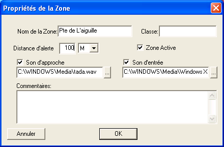 · Le son d’approche sera joué si on s’approche en deçà de la distance définie plus haut, et le son d'entrée sera joué si le bateau pénètre à l'intérieur de la zone.