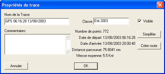 On peut consulter les propriétés des traces à travers le menu contextuel en cliquant dessus avec le bouton droit de la souris dans la fenêtre principale ou la fenêtre objets. La boite de dialogue suivante apparaît :