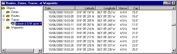 La liste des zones de danger, de waypoints, et de routes peut être obtenue grâce à " Menu - Affichage - Objets ". On obtient alors une nouvelle fenêtre dans le style de l’explorateur Windows. Dans la partie gauche, on a quatre " répertoires ", qui correspondent aux Zones de danger, Routes, Traces et Waypoints. En cliquant sur un de ces chapitres, on obtient dans la partie droite la liste des objets de ce type, avec des informations différentes en fonction du type d’objet. Si on ouvre un des chapitres Routes ou Traces (en cliquant sur + ), on obtient la liste des routes ou traces dans la partie gauche, et si on clique sur une de ces routes ou traces, on obtient la liste des waypoints ou points de trace dans la partie droite. On peut y consulter entre autres les infos des traces créées automatiquement par l’interface GPS.