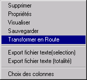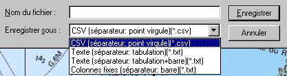 · Export Fichier texte: permet de sauvegarder les éléments sélectionnés, ou toute la liste dans un fichier au format texte en vue d'être imprimé ou être mis en page ou exploité par d'autres applications comme Excel. Plusieurs dérivés du format texte sont proposés. Le format CSV est particulièrement adapté pour pouvoir être importé ensuite dans Excel. Le format "Colonnes fixes" sera le plus adapté pour faire une consultation et/ou une impression pour faire des feuilles de route avec le Bloc Note Windows. Les autres formats sont des variantes, le seul élément changeant étant le séparateur figurant entre les colonnes.