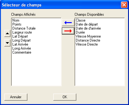 · Choix des colonnes: ouvre un dialogue qui permet de choisir, pour le type d'objet visualisé, les champs affichés ainsi que l'ordre d'affichage des colonnes. Le principe est le même pour la fenêtre "Objets" que pour la fenêtre "Bibliothèque de cartes":